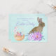 A beautiful Easter bunny sits behind a gorgeous bouquet of purple and teal flowers on a lovely pastel teal watercolor party invitation with elegant personalised lavender script of your family name under Happy Easter. Chic, pretty Easter egg hunt or brunch invite.