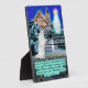 Beautiful 5 x 7 Eskie and Angel Scripture Plaque, with an easel, of a colourful, detailed winter scene with a soiled, homeless White American Eskimo Dog who is lost in a snowstorm. The dog is on bended knees and praying with paws together to a glorious Angelic Heavenly Being. She has a beautiful purple and white aura around her head and is at the entrance of a charming home. She has opened the iron gate for the lost dog and is welcoming the dog through the gate with outstretched hands. She has sanctified this home as the dog's new home by enveloping it with blue sparkles from Heaven. This scene accompanies the Bible verse Matthew 6:33, "But seek ye first the kingdom of God, and His righteousness; and all these things shall be added unto you." This plaque makes a wonderful gift or can be used to remind us of the Word of God.