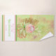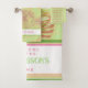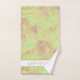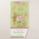 Beautiful, well made, tropical flowers inspired aesthetic BATH towel set, by TheLakeIsland. The bath towel features a watercolor flower composition and custom name or short text at the centre of a white square over weathered, batik green sand-pinkish background. The hand towel features the same batik background, while the wash cloth is solid light green, with your name and initial.