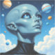 A beautiful female alien extraterrestrial being with big blue eyes looking up into space at the stars and planets.