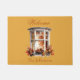 A beautiful fall window welcome mat, this design features an fall window decorated with pumpkins and leaves. "Welcome" is written at the top in beautiful brown font. Underneath is a template for inserting your name. Order yours today!