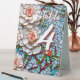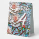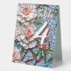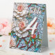 Wedding table numbers. A gorgeous illustration mimicking a stained glass and tiles mosaic of coral roses and with blue and other colourful accents.