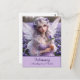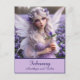 A beautiful pale lavender haired fairy with white and silvery wings wearing a pretty lavender dress and an amethyst necklace holds a single violet while standing in a field of violets.