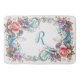 Beautiful bathroom mat, with artwork of colourful garland of flowers all around the edge, against a white background. Personalise the one letter peacock blue monogram to suit your needs. Pretty bath decor, matching products are available.