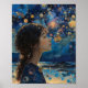 A beautiful girl dreams at the ocean at night mixed media style painting in blues and golds AI generated art