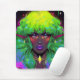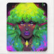 A beautiful glorious elven queen. She has full lips with pinkish purple lipstick, subtle rosy blush, and long eyelashes. She has beautiful, bright lime green hair ombre that gets darker towards the ends. She has elven ears and a beautiful golden choker necklace.