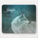 A mouse pad with a photograph of a gorgeous furry fluffy grey wolf. In the background is a dark forest with trees. Magical mystical vibe.