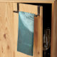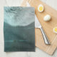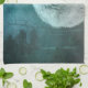 Kitchen towel with a photograph of a gorgeous furry fluffy grey wolf. In the background is a dark forest with trees. Magical mystical vibe.
