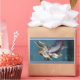 style painting in blue mauve and white. pretty angel is pointing to