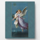vintage art with painting of a guardian angel flying over the town and holding a baby wrapped in a blanket.