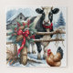 Pretty black and white cow with a red bow and cute rooster. Background has a red rustic barn and a wood fence decorated in Christmas garland. A pretty watercolor scene of a snowy winter day on the farm.