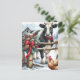 Pretty black and white cow with a red bow and cute rooster. Background has a red rustic barn and a wood fence decorated in Christmas garland. A pretty watercolor scene of a snowy winter day on the farm. Back of the postcard can be personalised with your own holiday greeting and family names.
