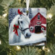 Personalised Christmas ornament. Pretty white horse with a red bow and cardinal on her head. Background has a red rustic barn with Christmas wreaths on it. A pretty watercolor scene of a snowy winter day on the farm.