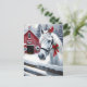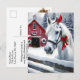 Pretty white horse with a red bow and cardinal on her head. Background has a red rustic barn with Christmas wreaths on it. A pretty watercolor scene of a snowy winter day on the farm. Back of the postcard can be personalised with your own holiday greeting and family names.