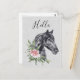 A hello postcard with a beautiful illustration of a black horse head with a fancy floral bouquet by it's neck. Elegant and classy animal painting. Grey mottled background.