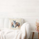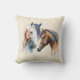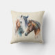 A pillow with a beautiful watercolor drawing. Featuring a pair of horses, brown and white. Head and neck visible with dripping paint along the base of their neck. Southwestern vibe.