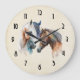 A clock with a beautiful watercolor drawing. Featuring a pair of horses, brown and white. Head and neck visible with dripping paint along the base of their neck. Southwestern vibe.