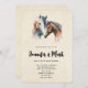 Wedding invitation with a beautiful watercolor drawing. Featuring a pair of horses, brown and white. Head and neck visible with dripping paint along the base of their neck. Southwestern vibe.