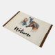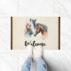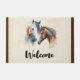 A welcome doormat with a beautiful watercolor drawing. Featuring a pair of horses, brown and white. Head and neck visible with dripping paint along the base of their neck. Southwestern vibe.