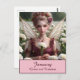A beautiful buff haired fairy with white and buff coloured wings wearing a pretty burgundy dress and a garnet necklace holds a single white carnation while standing in a field of carnations.