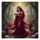 A beautiful fairy wearing a flowing red dress and jewellery made of rubies with water lilies in her long red hair and light red dragonfly-like wings holding a water lily stands in a shallow pond in a magical forest surrounded by water lilies, lily pads, pink flowers and vine-covered trees.