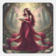 A beautiful fairy wearing a flowing red dress and jewellery made of rubies with water lilies in her long red hair and light red dragonfly-like wings holding a water lily stands in a shallow pond in a magical forest surrounded by water lilies, lily pads, pink flowers and vine-covered trees.