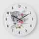 A clock with a beautiful illustration featuring a grey, black and white leopard portrait. This lovely animal is surrounded by a tropical flower bouquet. Elegant, exotic and lovely.