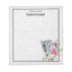 A notepad with a beautiful illustration featuring a gray, black and white leopard portrait. This lovely animal is surrounded by a tropical flower bouquet. Elegant, exotic and lovely.