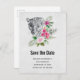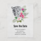 Save the date postcard with a beautiful illustration featuring a grey, black and white leopard portrait. This lovely animal is surrounded by a tropical flower bouquet. Elegant, exotic and lovely.