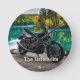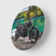 This illustration shows a motorcycle parked near a beautiful blue lake.