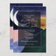 Modern metallic gold sunset and silver glowing moon landscape artsy design, featuring an amazing white and silver glowing crescent moon, faux metallic gold sun, pink and dark blue evening gradient colours sky with shining white stars and stardust, green mountain, pink mountain, and dark blue mountain and a soft powder blue river stunning illustration. Minimalist boho nature landscape aesthetic art.