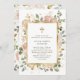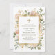 This gorgeous, floral Baptism or Christening invitation features an elegant, gold rectangular frame with a matching gold cross, surrounded by lovely rustic watercolor flowers in neutral and blush shades, and gold and green leaves. The background of the card is white. The back of the card features a matching floral pattern, with your baby's photo in a gold-framed circle in the centre.