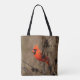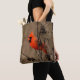 Awesome red bird in the branches of a dead or fall tree with brown leaves. The background makes the bright red of the birds feathers stand out and pop.