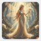A beautiful fairy wearing a flowing topaz-coloured dress and jewellery made of topaz with topaz and chrysanthemums in her long golden hair and light topaz-coloured wings holding a chrysanthemum stands in a magical forest surrounded by chrysanthemums, blue and gold flowers and trees covered in vines and flowers.