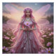 A beautiful fairy wearing a flowing pink dress and a necklace made of opals with opals and cosmos flowers in her long pink hair and light pink dragonfly-like wings holding a pink cosmos flower stands in a magical field of cosmos flowers surrounded by bubbles against an afternoon sky.