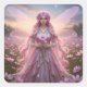 A beautiful fairy wearing a flowing pink dress and a necklace made of opals with opals and cosmos flowers in her long pink hair and light pink dragonfly-like wings holding a pink cosmos flower stands in a magical field of cosmos flowers surrounded by bubbles against an afternoon sky.
