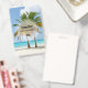 A name tag with a beautiful and tranquil photograph of 2 palm trees under a bright blue sky.