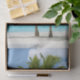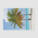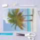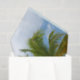 Tissue paper with a beautiful and tranquil photograph of 2 palm trees under a bright blue sky.
