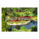 View into a lovely garden. Water, pink and yellow flowers, palm trees and cypresses. Photo taken at Flor and Fjaere Park, Stavanger region, Norway.