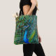 Tote bag featuring a magnificent peacock with its beak open and tail feathers opened in a wide fan, showing off his exquisite iridescent green, blue and bronze colored feathers. A beautiful fashion accessory for bird and nature lovers. Photo taken in Arcadia, California.