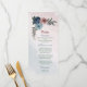 Beautiful pink, dusty blue and navy blue flowers with green leaves botanical menu.