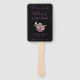 A beautiful purple black wedding program hand fan, this item is set on a black background the font is purple with a purple watercolor flower. Use the easy templates for filling out your information.