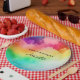 Birthday paper plates with a watercolor background featuring colours of the rainbow.