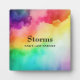 A photo plaque with a watercolor background featuring colours of the rainbow. Text says: Storms don't last forever.