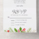 This beautiful red and green Christmas all in one wedding invitation features bright poinsettia flowers at the top of your invite and holly berries and leaves at the bottom. A festive and bright card with detachable RSVP card for a holiday wedding.