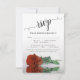 This beautiful RSVP card features a simple yet elegant design with a single long-stemmed rust orange or burnt umber coloured rose reflecting in a pool of water with ripples and waves. The title is written in lacy script calligraphy and there is space for your guests to indicate the total number that will be attending and their choice of meal.