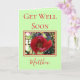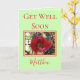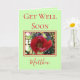 Featuring a beautiful light green background, this customised greeting card displays "Get Well Soon" at the top in red font. There is a beautiful picture of a red rose in a garden in the centre. Underneath the photo is your loved one's name displayed in lovely cursive font. The inside of the card shares a special message of encouragement.