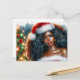 This festive postcard features a gorgeous dark-skinned woman with thick, wavy long hair wearing a Santa hat and Santa-inspired dress. A Christmas tree is in the background behind her, emphasizing the holiday theme.