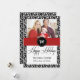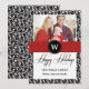 A dramatic design with a black and white abstract background, a bold red ribbon and a monogram circle in the centre. The words "Happy Holidays" is preprinted in the front.