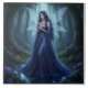A beautiful fairy wearing a flowing dark blue dress and a necklace made of sapphires with sapphires in her long dark blue hair and translucent dragonfly-like wings holding an aster stands in a shallow pond in a magical forest surrounded by asters, orange mushrooms and trees covered in vines, flowers and mushrooms.